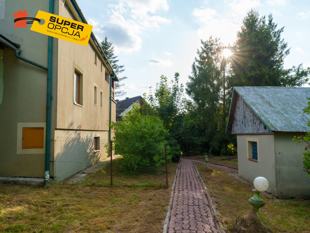 Nieruchomość do sprzedaży to ogromny teren (80 arów) ogrodzony, składający się z dużego budynku mieszkalnego i budynku garażowego.