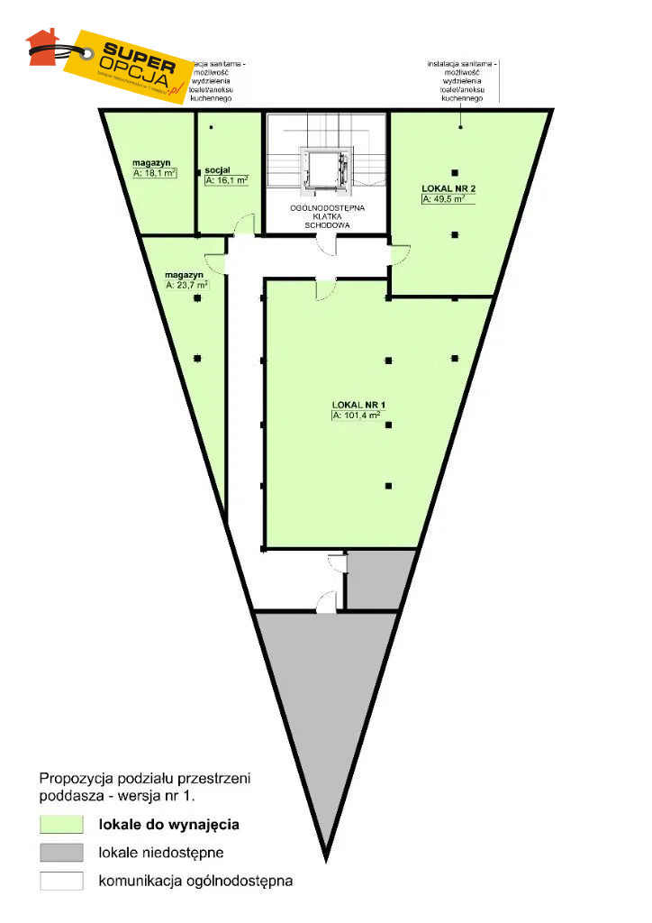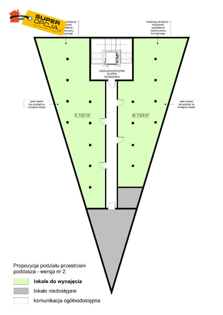 Szczegóły oferty: Pomieszczenia: otwarta przestrzeń z możliwością adaptacji, opcja podziału na kilka pomieszczeń + zaplecze socjalne (aneks kuchenny, łazienki) Media: prąd, ogrzewanie gazowe, Dostęp: winda w budynku Stan techniczny: lokal gotowy do adaptacji, z wysokimi skosami i widocznymi elementami konstrukcyjnymi, do aranżacji według potrzeb najemcy