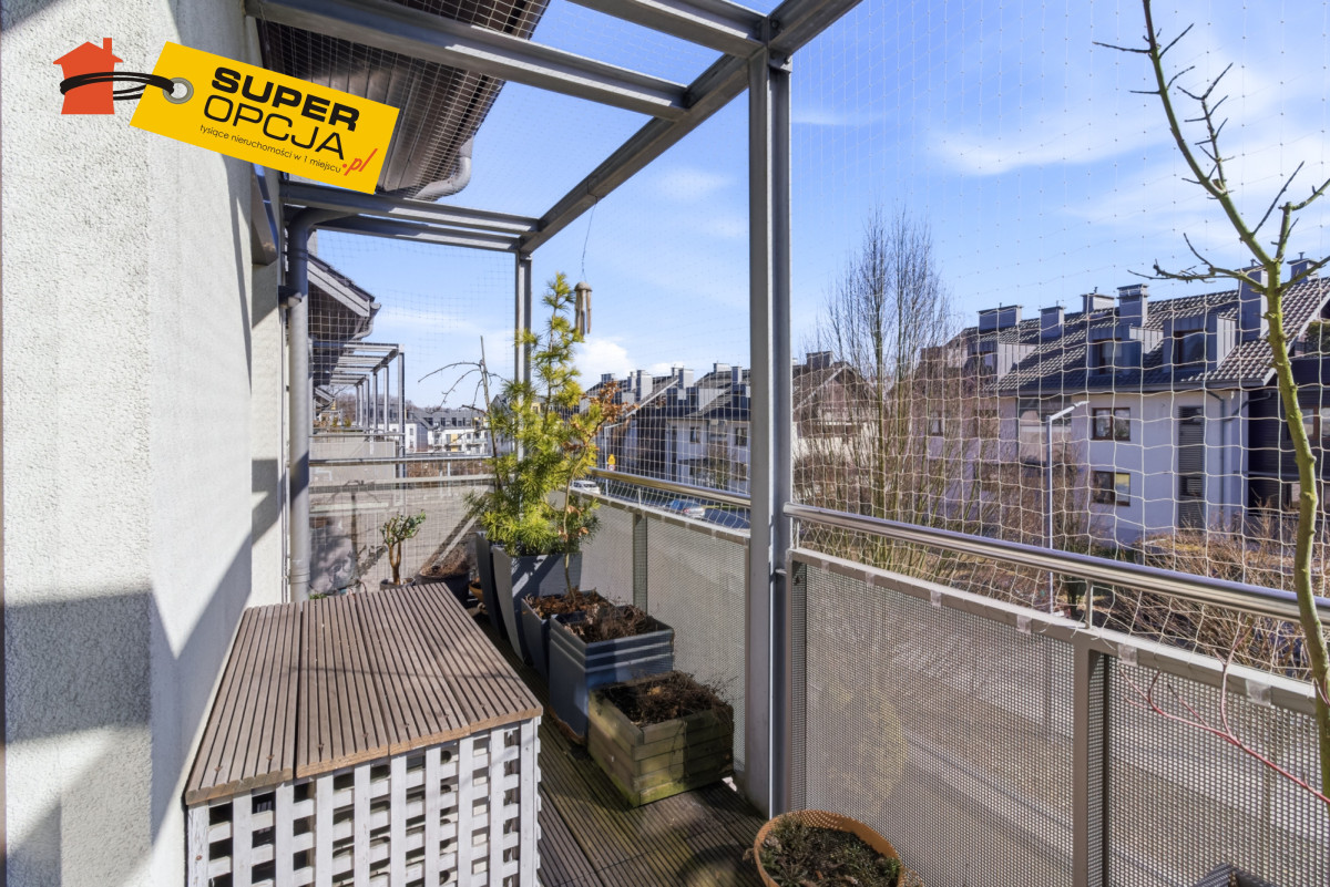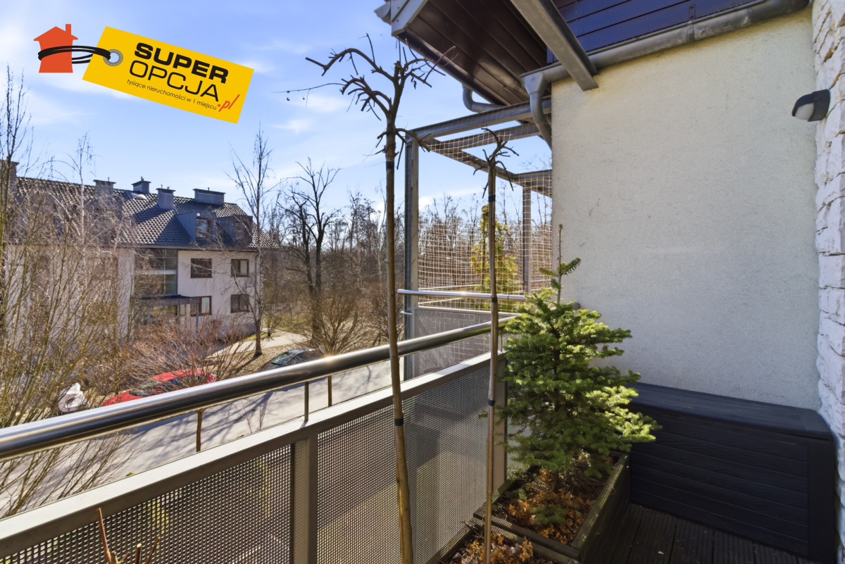 Relaks: 2 balkony z widokiem na kameralną, niską zabudowę i zieleń.