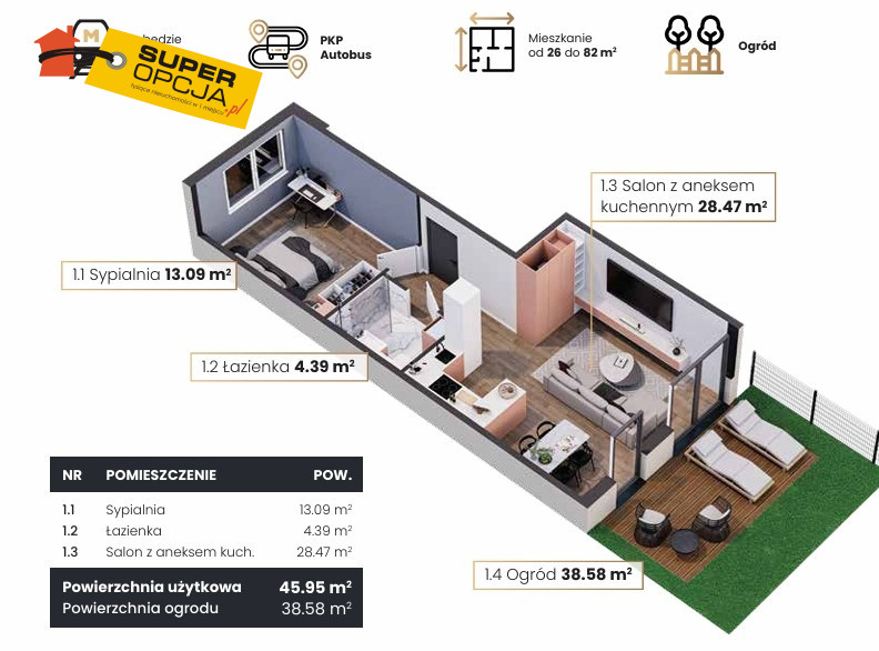 Mieszkanie: - salon z aneksem kuchennym - sypialna - łazienka - przedpokój - ogródek 38 m2 - zewnętrzne miejsce postojowe opcjonalnie