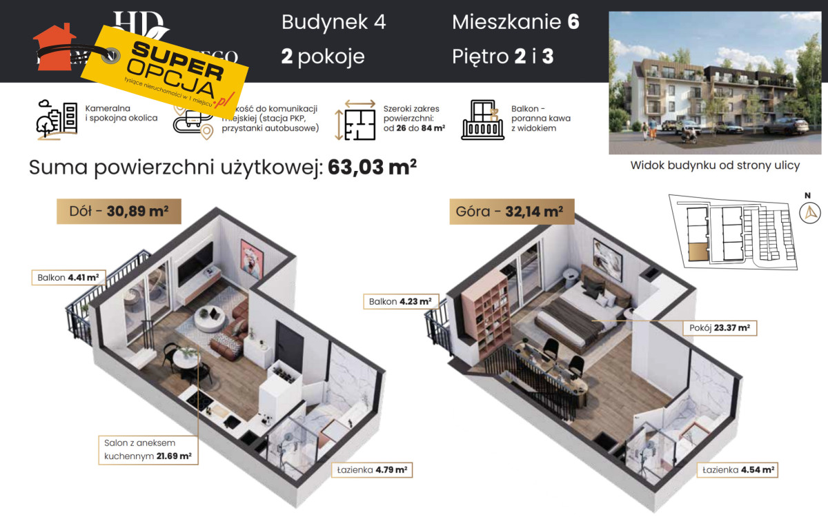 Przestronne 2 poziomowe mieszkanie 2 balkony, 2 łazienki, położone w nowoczesnym budynku nowej inwestycji Harmonia Dębskiego. Idealne dla pary lub singla, którzy cenią komfort, gustowny design i prywatność. Duże przeszklenia i 2 balkony sprawiają, że mieszkanie jest wyjątkowo jasne i przestronne.