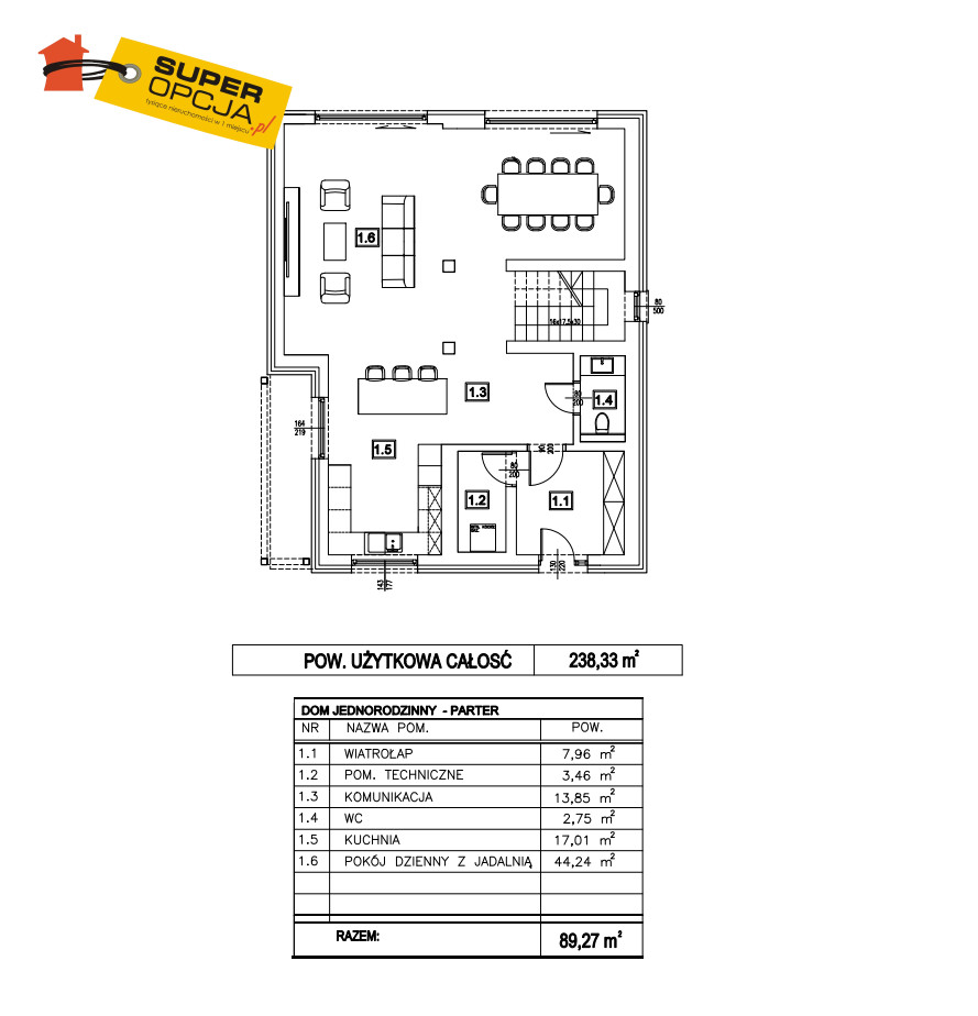 - na parterze znajduje się: duży salon z częścią wypoczynkową i jadalnią, kuchnią częściowo otwartą na salon, garderoba, hall, łazienka,