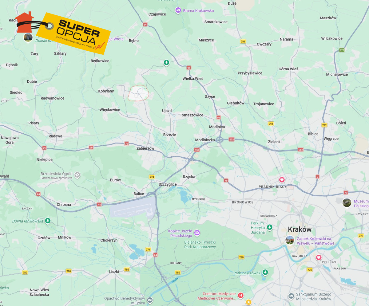 Lokalizacja i otoczenie około 15 km od centrum Krakowa spokojna, zielona okolica z zabudową jednorodzinną w pobliżu Ojcowski Park Narodowy, Dolina Bolechowicka oraz liczne trasy spacerowe i rowerowe sklepy, szkoła, przedszkole i podstawowe usługi w zasięgu kilku minut