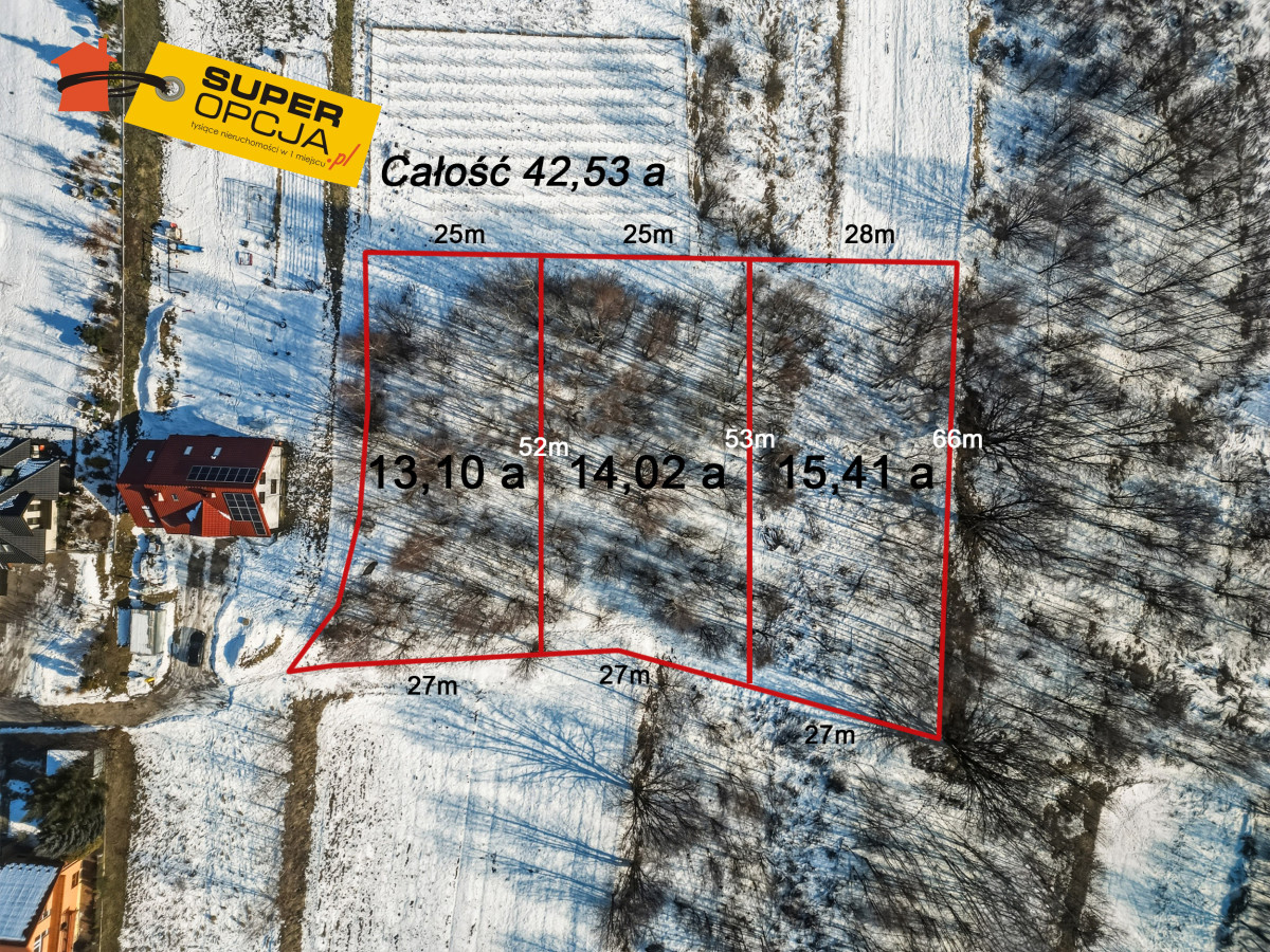 Działka w całości: 42,53 a (4253 m²) 54mx78m - duża, jednolita powierzchnia idealna pod większy dom z dużym ogrodem, część rekreacyjną LUB mniejsza jest już podział na trzy, możliwość zakupu jednej.: