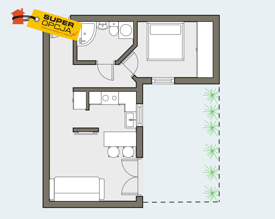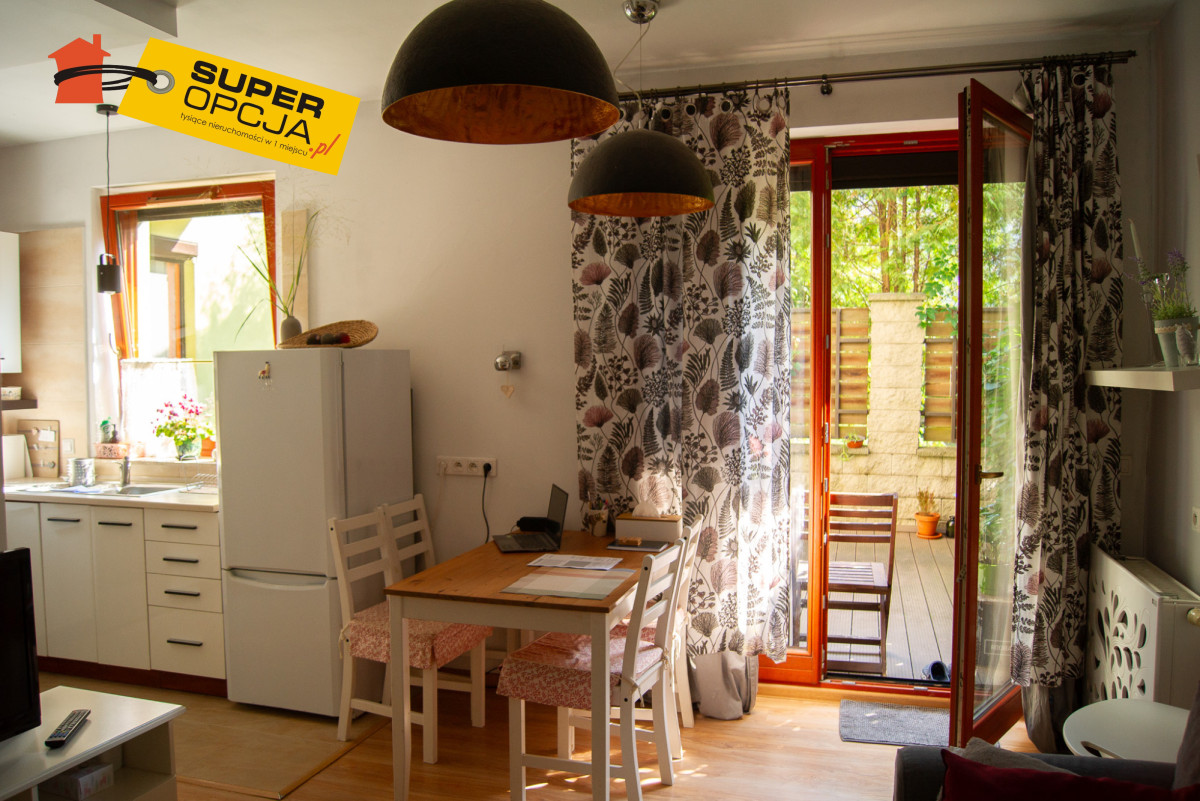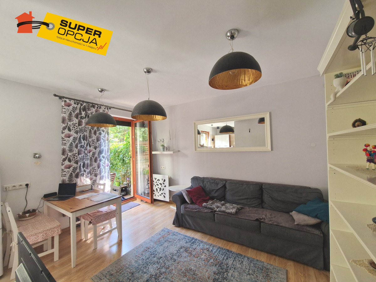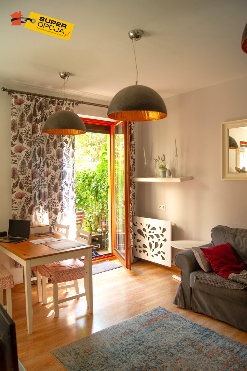 Apartament składa się z: - pokoju dziennego z aneksem kuchennym, - sypialni, - łazienki, - holu. Do mieszkania przynależy ogródek z tarasem (o pow. ok. 20m2)
