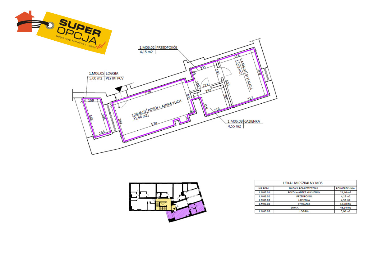 Układ mieszkania: • salon z aneksem kuchennym • sypialnia • łazienka • przestronny balkon typu loggia (ok. 6-7 m²) • klimatyzacja • wysokość ok 2,90m, co umożliwia zaaranżowanie antresoli.