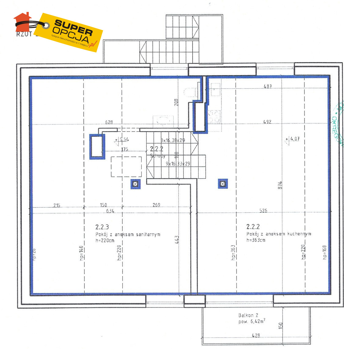 - poziom 2: serce mieszkania - przestronny, wysoki salon z balkonem i otwartą kuchnią, który możesz zaprojektować dokładnie tak, jak chcesz; h=3,63m