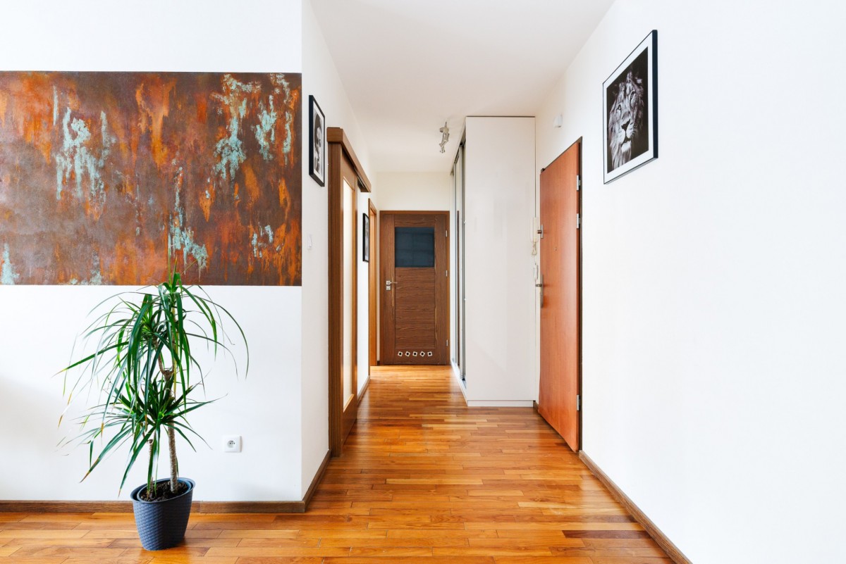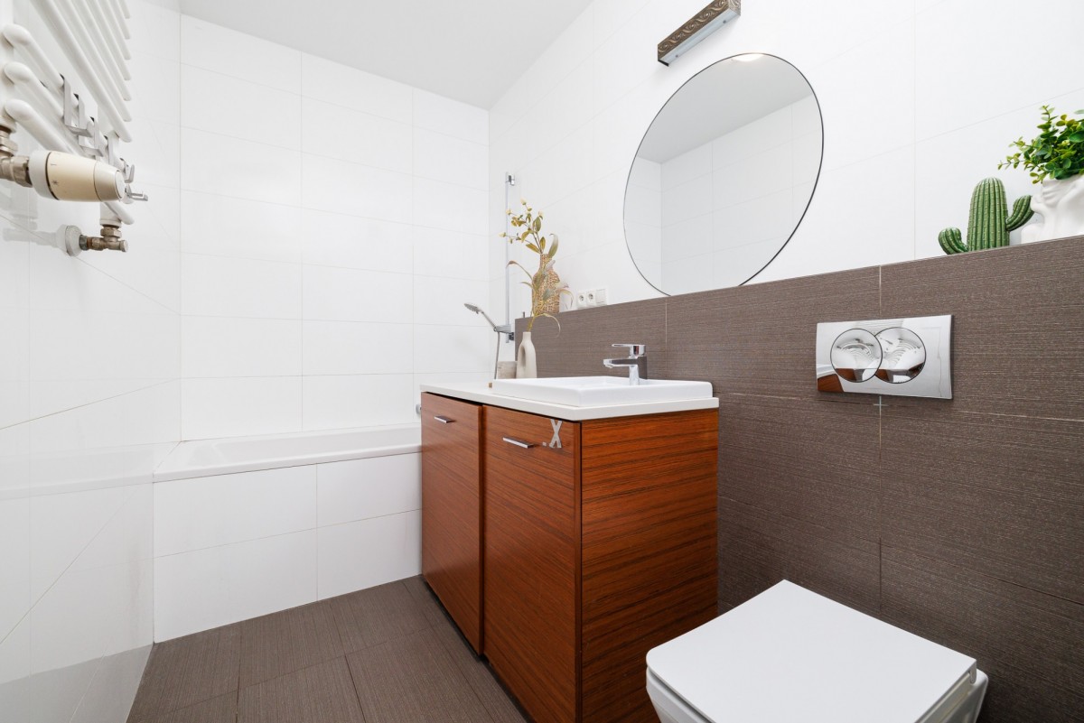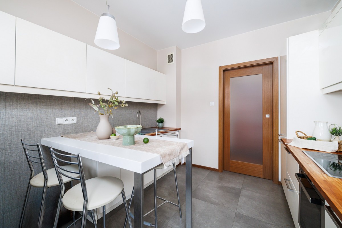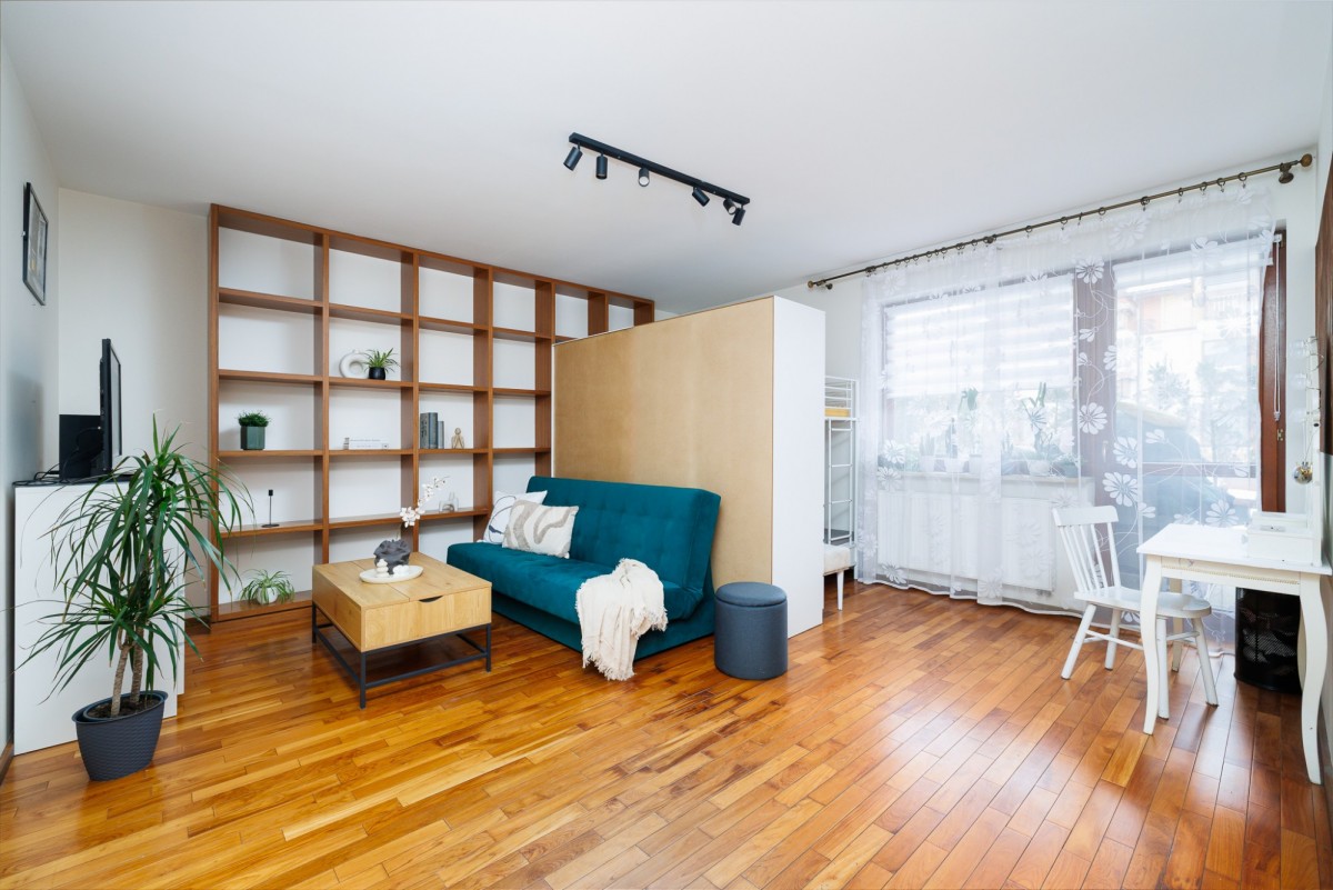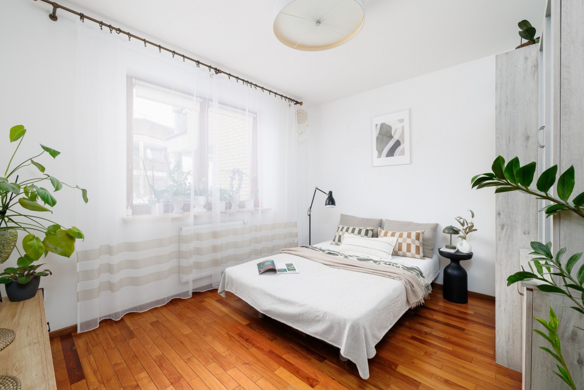 Mieszkanie urządzone jest w neutralnym, ponadczasowym stylu. Drewniane podłogi nadają wnętrzu ciepłego charakteru, a duże okna zapewniają bardzo dobre doświetlenie. Funkcjonalny układ pomieszczeń daje swobodę aranżacji — zarówno dla pary, singla pracującego z domu, jak i osób szukających spokojnej alternatywy dla życia w centrum miasta.