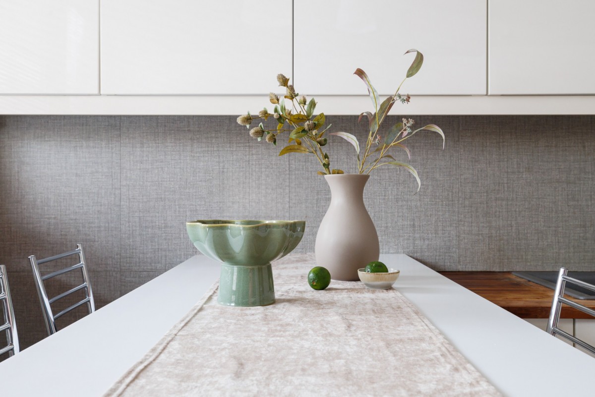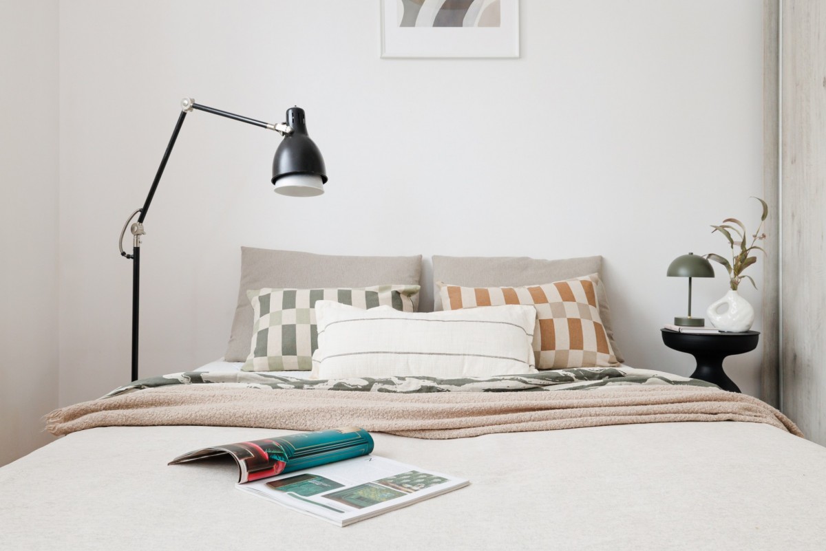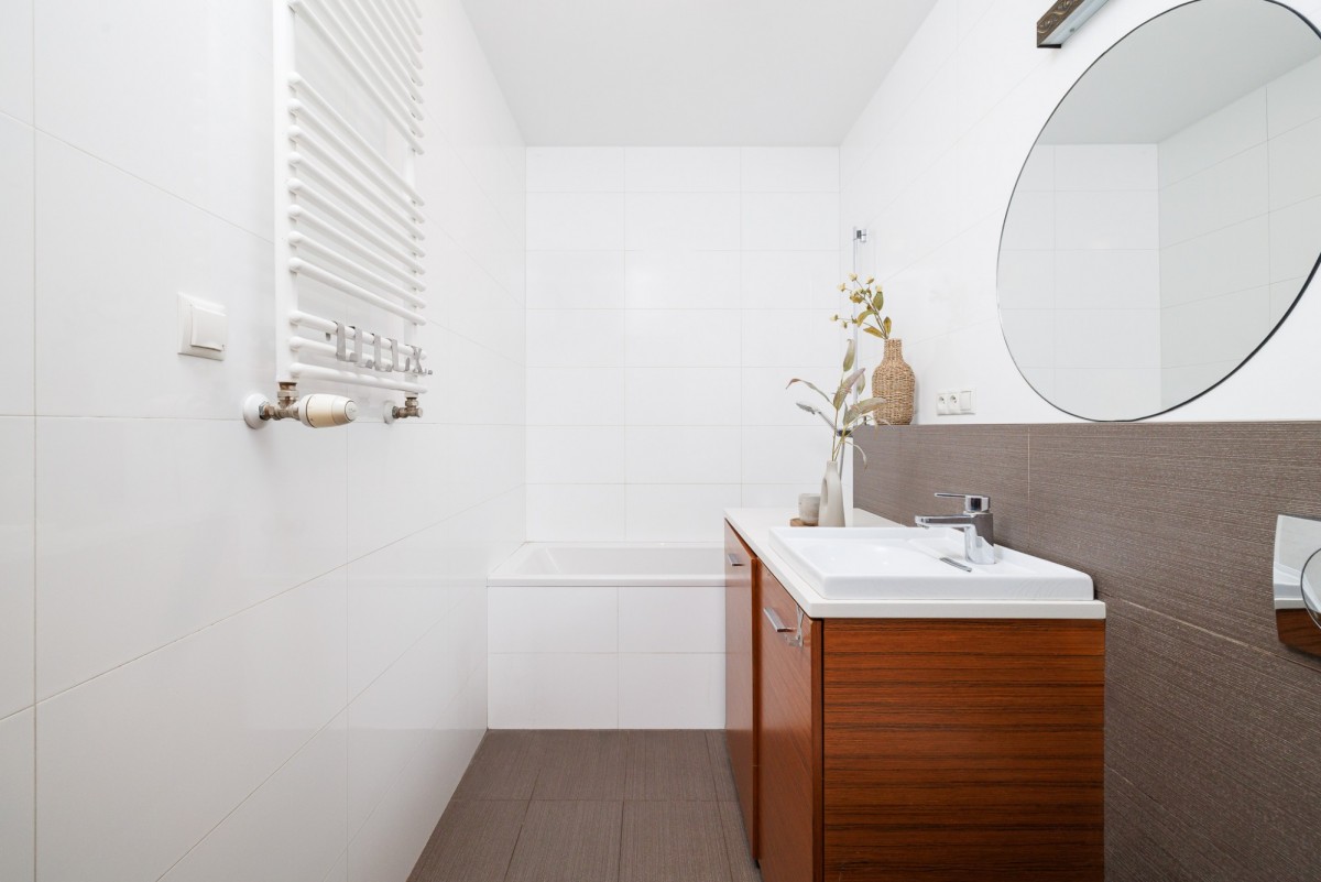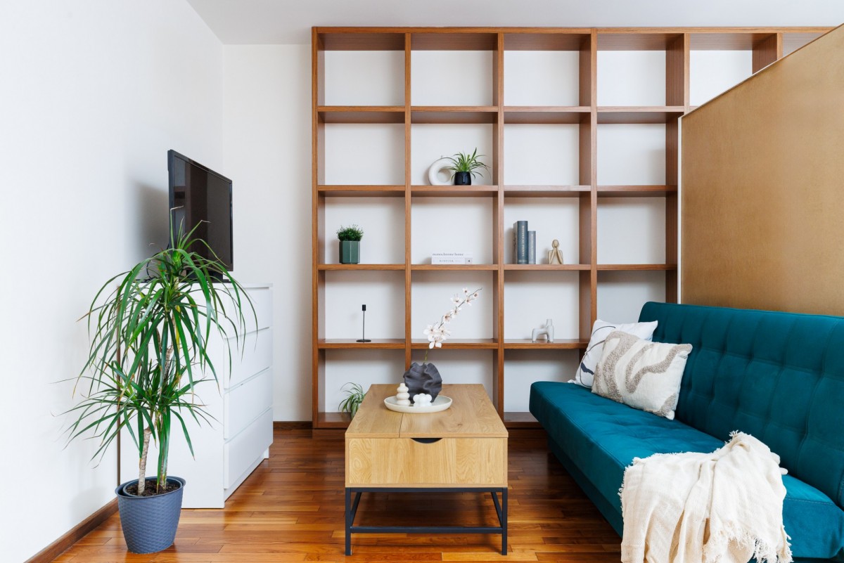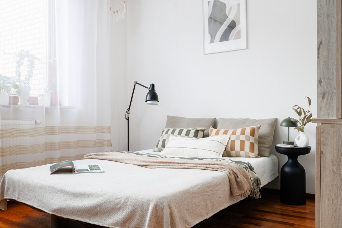 Mieszkanie urządzone jest w neutralnym, ponadczasowym stylu. Drewniane podłogi nadają wnętrzu ciepłego charakteru, a duże okna zapewniają bardzo dobre doświetlenie. Funkcjonalny układ pomieszczeń daje swobodę aranżacji — zarówno dla pary, singla pracującego z domu, jak i osób szukających spokojnej alternatywy dla życia w centrum miasta.