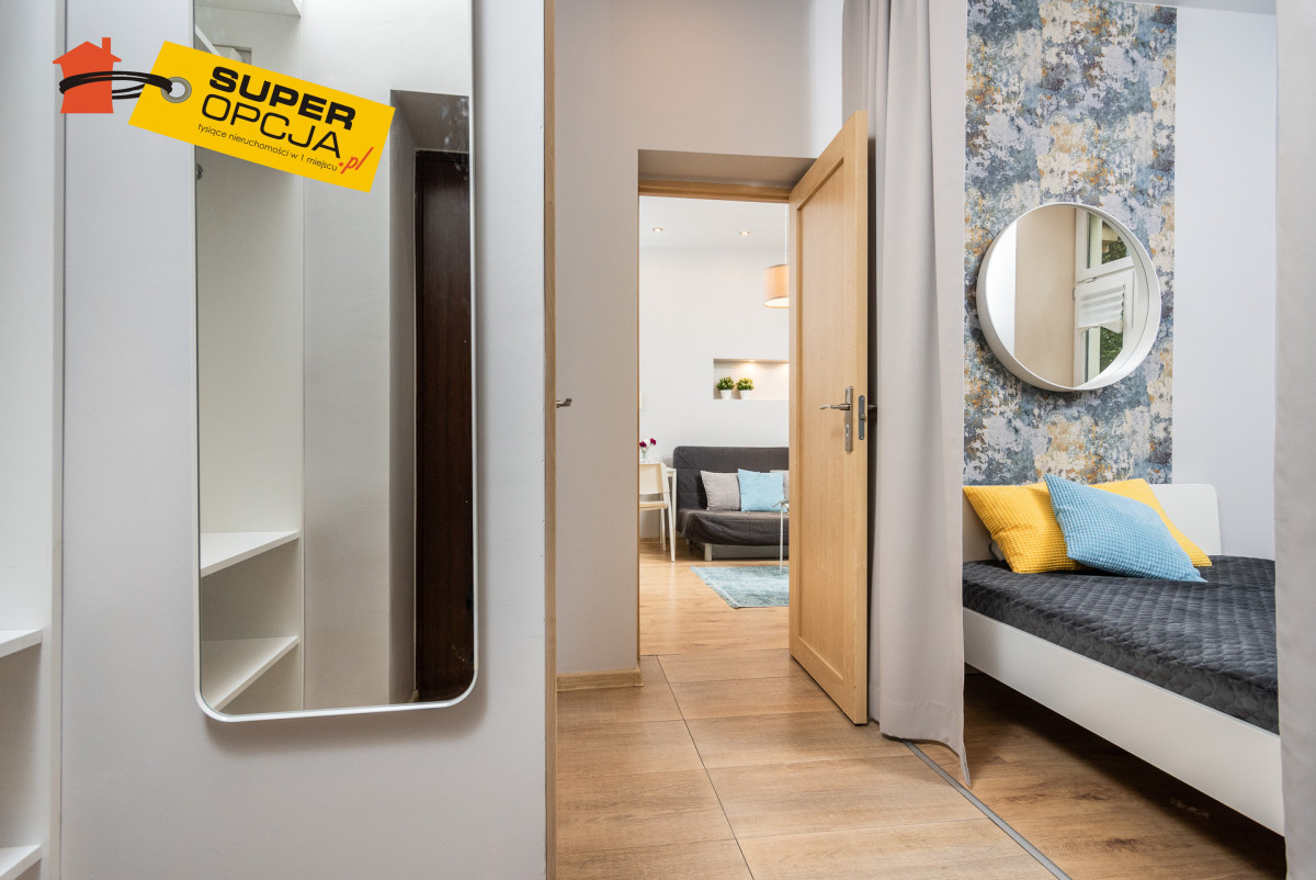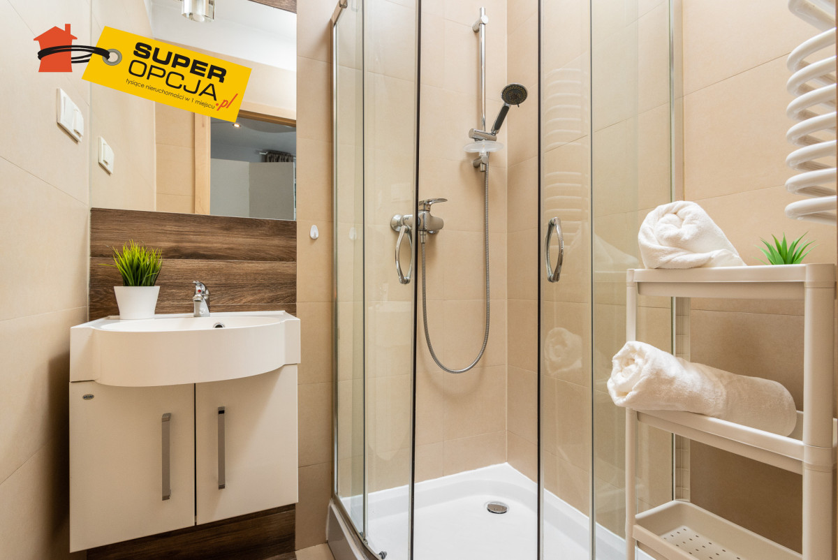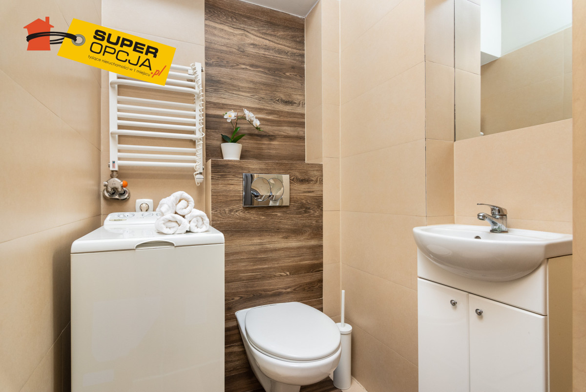 Mieszkanie składa się: - Salon z aneksem kuchennym - Mała sypialnia z łóżkiem 140 x 200 - Przedpokój z szafą w zabudowie - Oddzielne WC z pralką - Łazienka z prysznicem