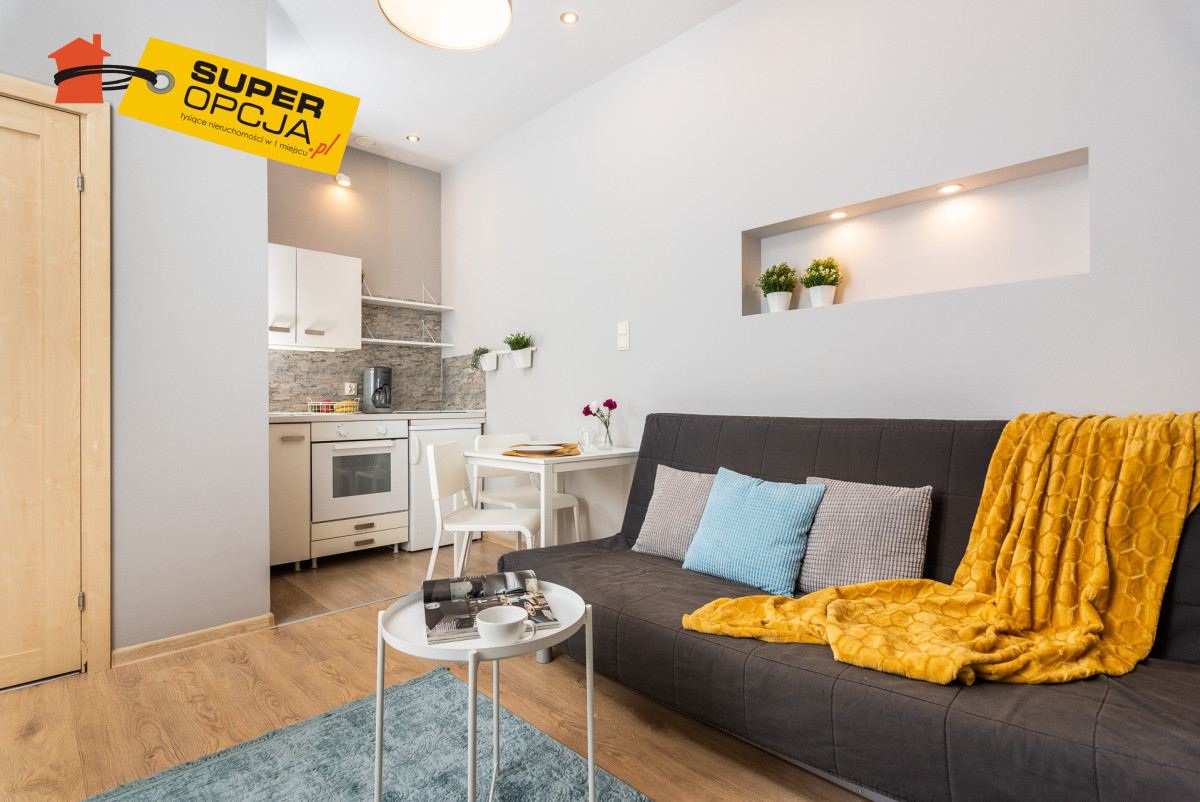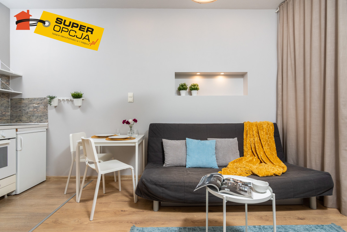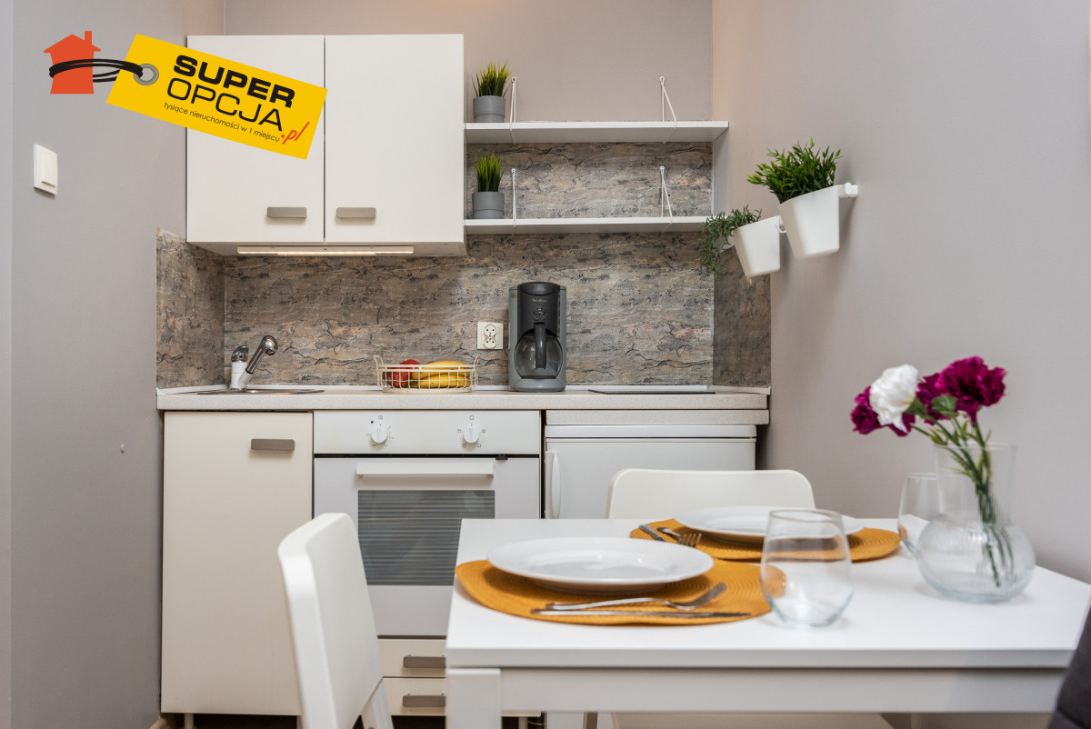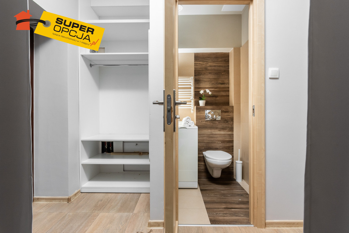 Mieszkanie składa się: - Salon z aneksem kuchennym - Mała sypialnia z łóżkiem 140 x 200 - Przedpokój z szafą w zabudowie - Oddzielne WC z pralką - Łazienka z prysznicem