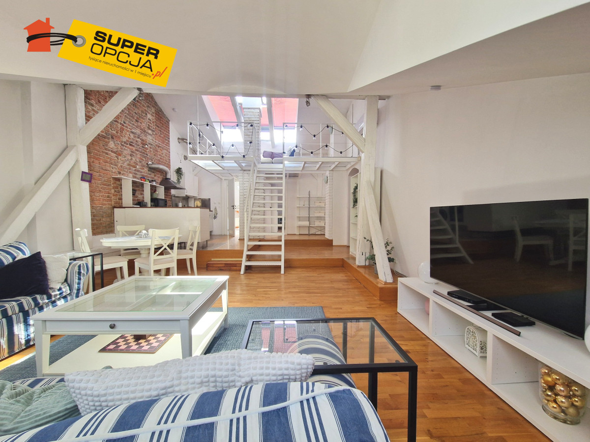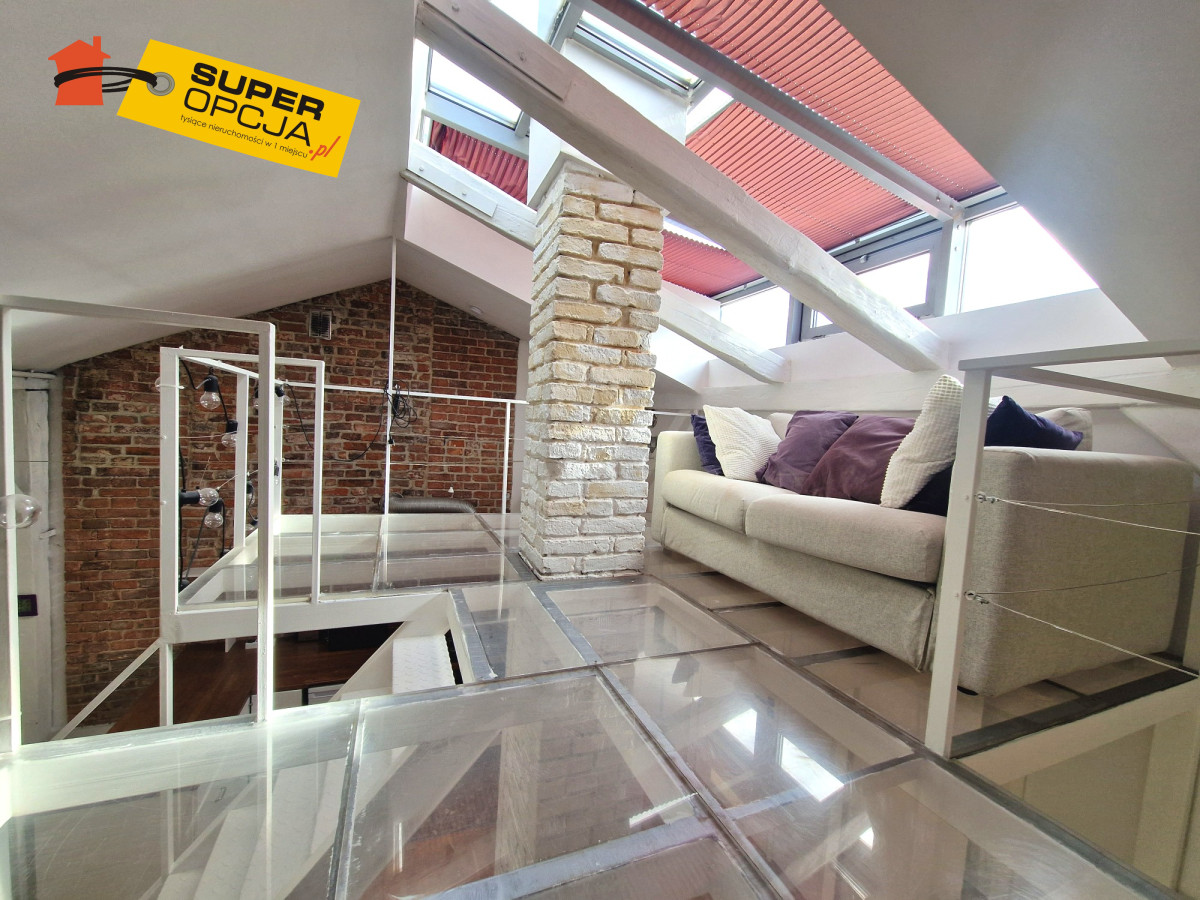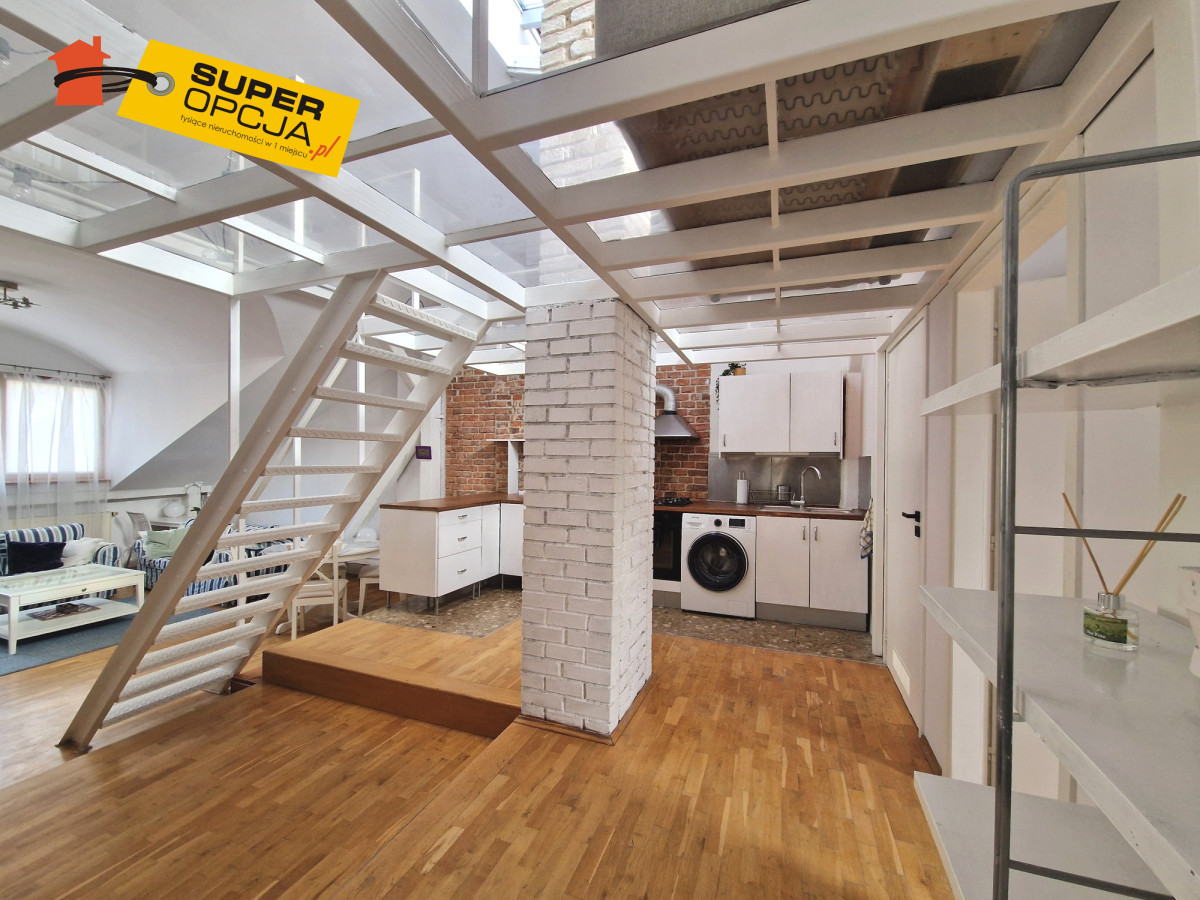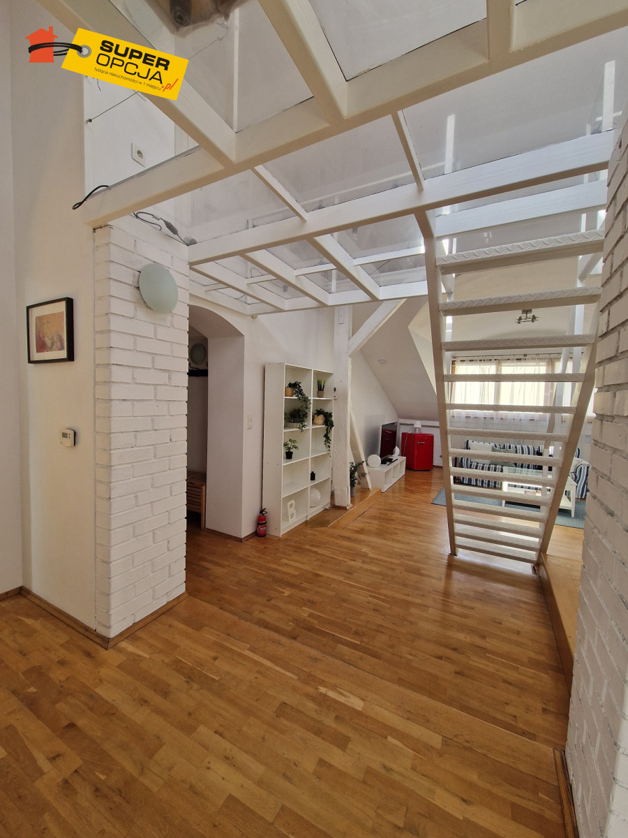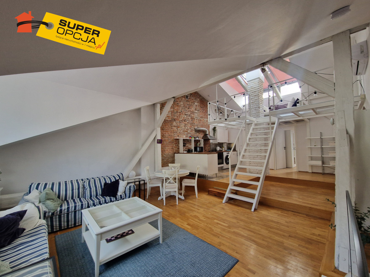 Mieszkanie zostało urządzone w stylu loftowym, charakteryzującym się otwartą przestrzenią. Składa się z następujących pomieszczeń: - 2 sypialnie doświetlone oknami dachowymi - salon z otwartą kuchnią - łazienka z prysznicem i wanną - przedpokój - antresola